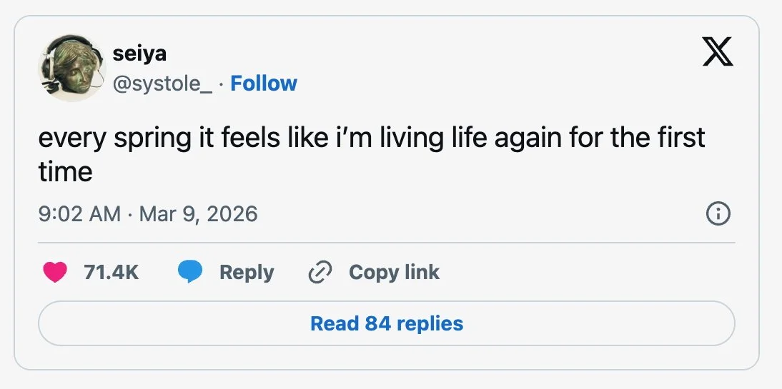 Something about early March feels so good. It always feels like the beginning of the real new year is starting up right now. I’ll take ten fake springs, the garbage beneath the melting snow, I don’t care, just give me a long March.